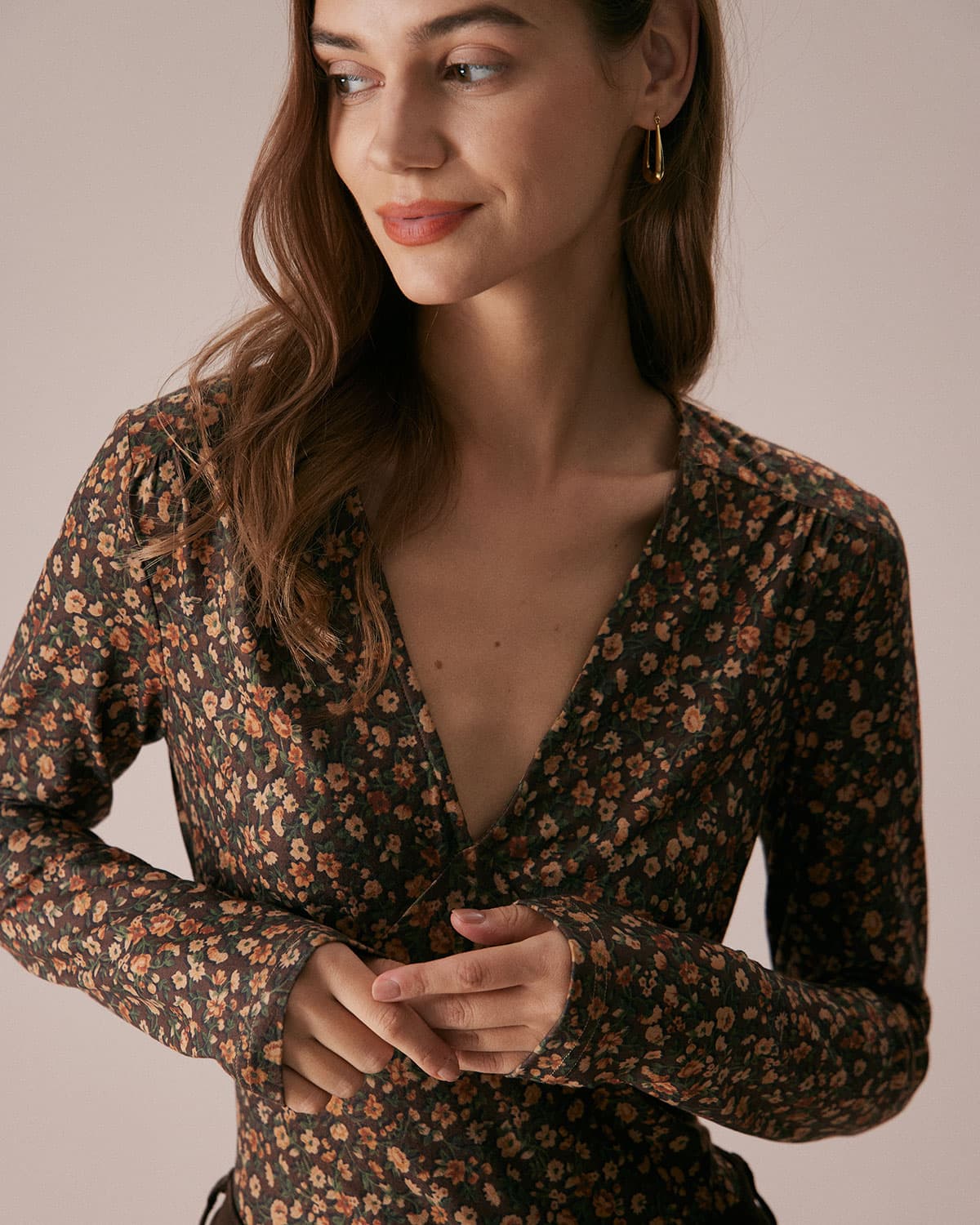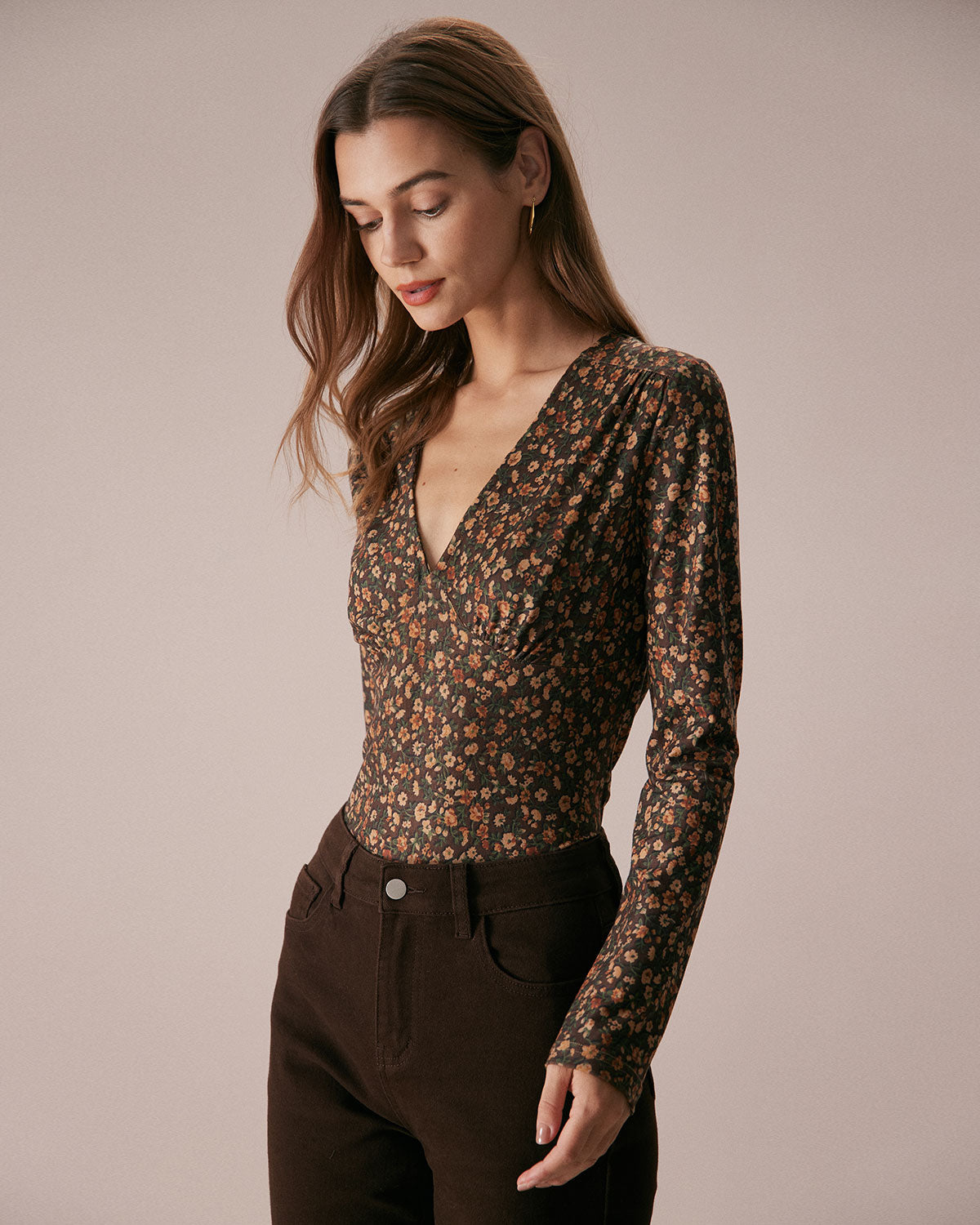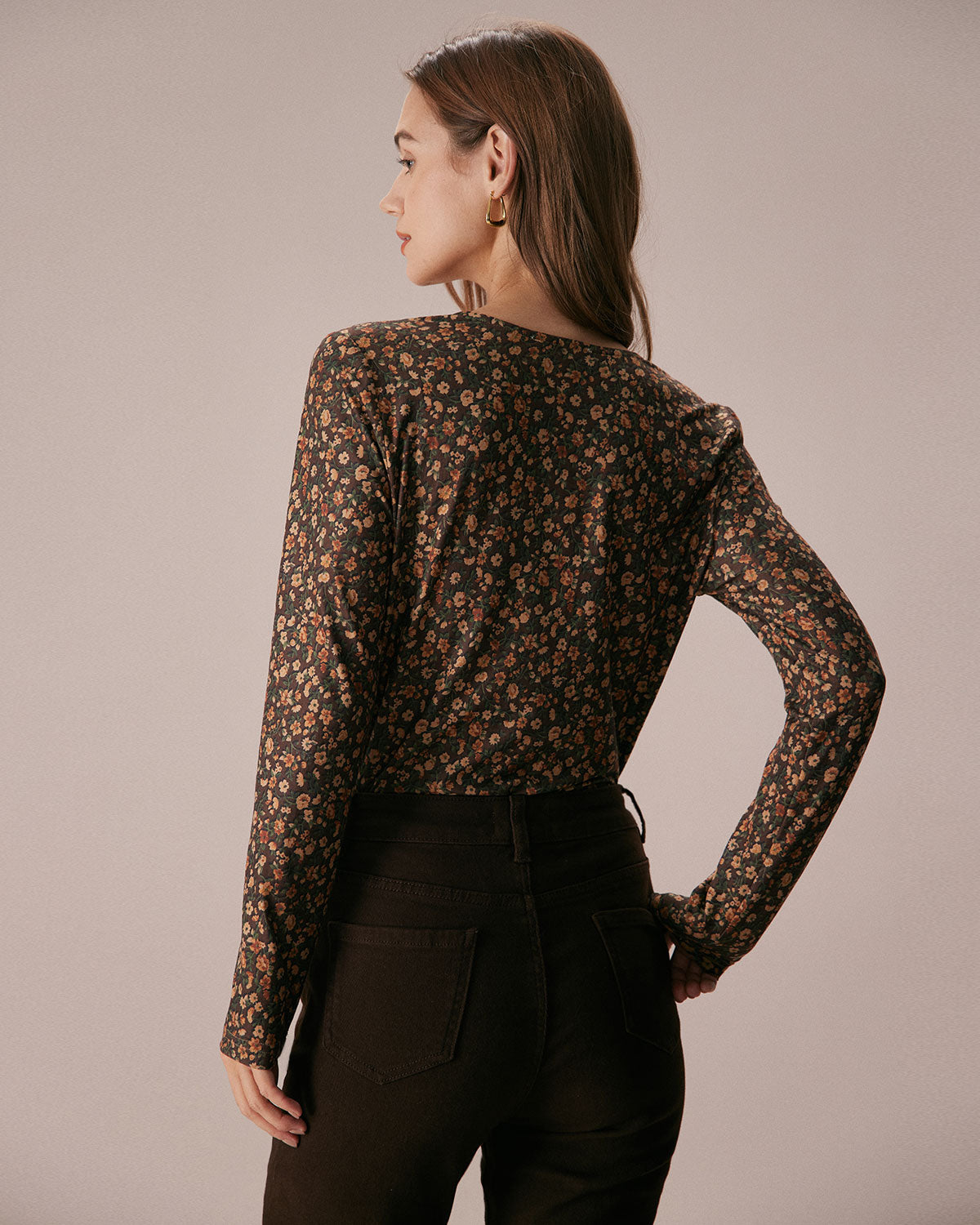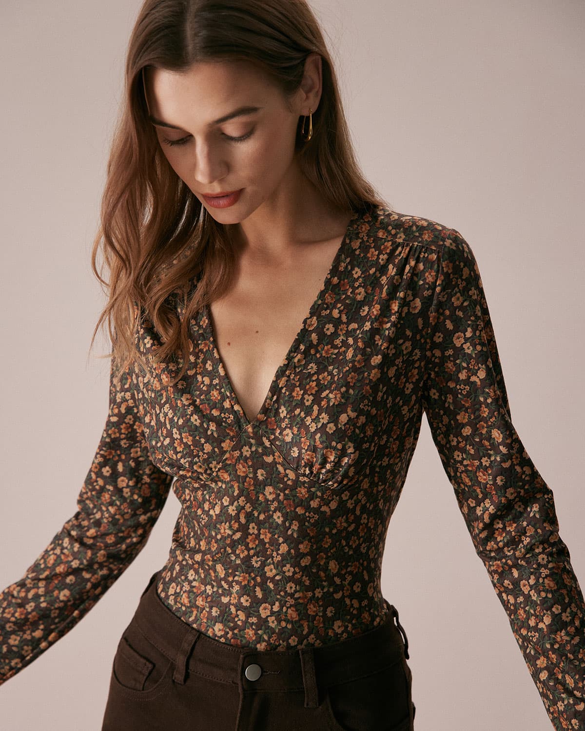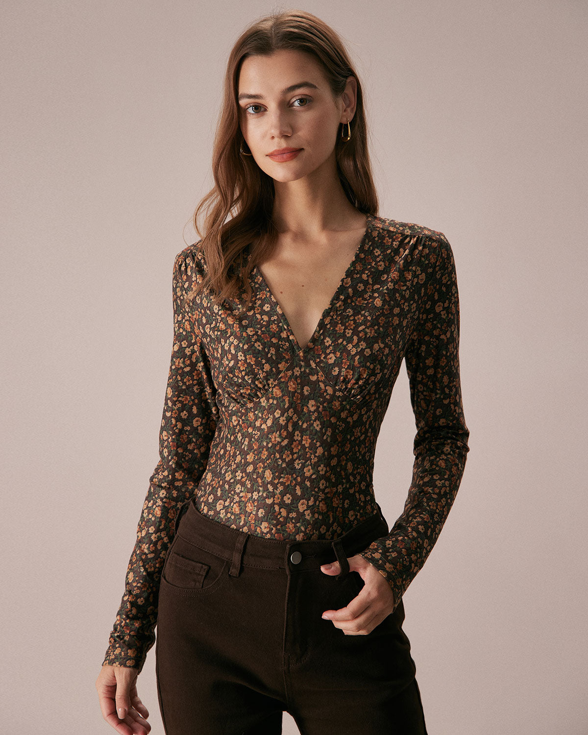 The Coffee V Neck Retro Floral Print Blouse